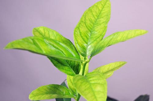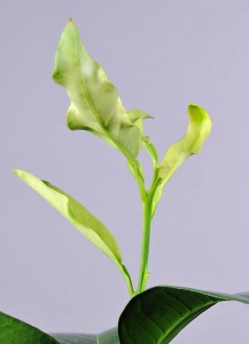 Los síntomas comienzan generalmente en las hojas más jóvenes con clorosis internerval de color verde amarillento a amarillo pálido, manteniendo verde las nervaduras.