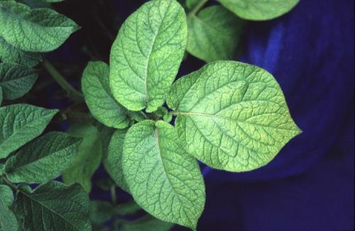 Las hojas son de color verde a amarillo pálido (izquierda) tienen un tamaño reducido y el crecimiento puede sufrir retrasos. Estos síntomas se ven a menudo primero en las hojas jóvenes.