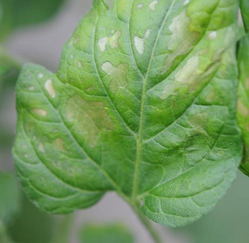 Los síntomas de deficiencia de magnesio comienzan en las hojas viejas. Muestran clorosis entre los nervios en los bordes y algunos puntos blanquecinos necróticos. Si la deficiencia es grave, la clorosis entre los nervios progresa desde los bordes hacia la mitad de la hoja. Los nervios pequeños también se vuelven cloróticos pero los grandes se mantienen verde oscuro al principio. Consecuentemente las hojas enteras se amarillean y finalmente las hojas viejas mueren. En este caso el crecimiento se ve gravemente alterado y se reduce la producción de frutos.