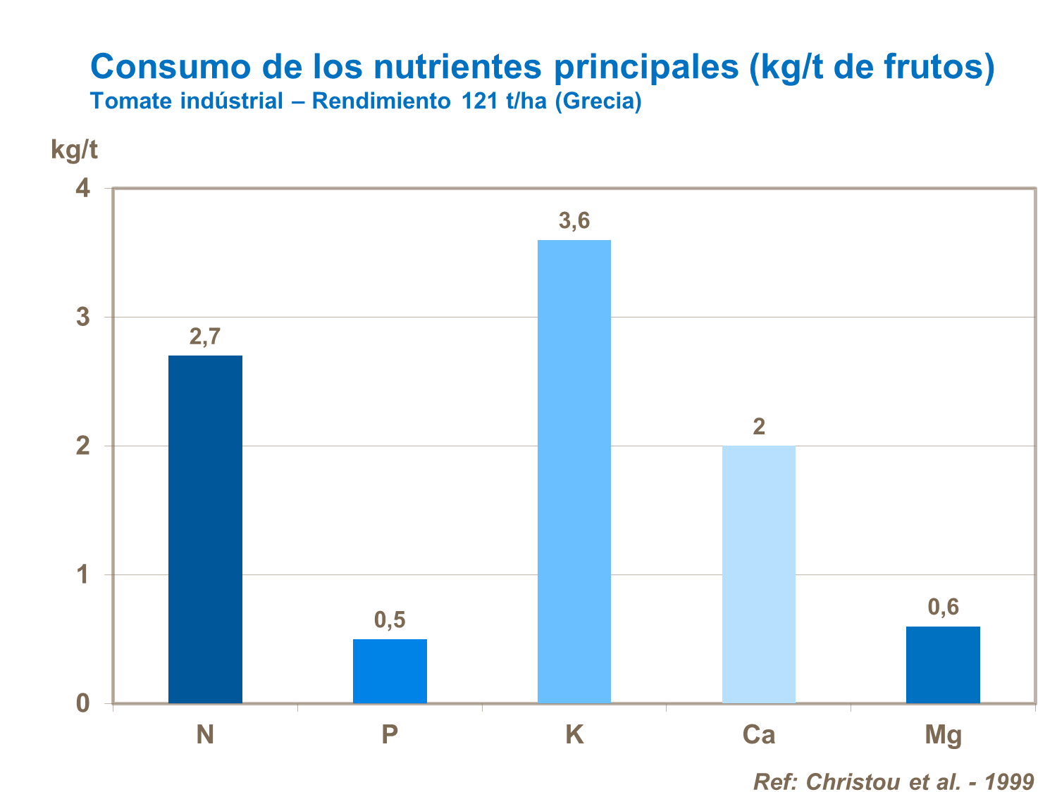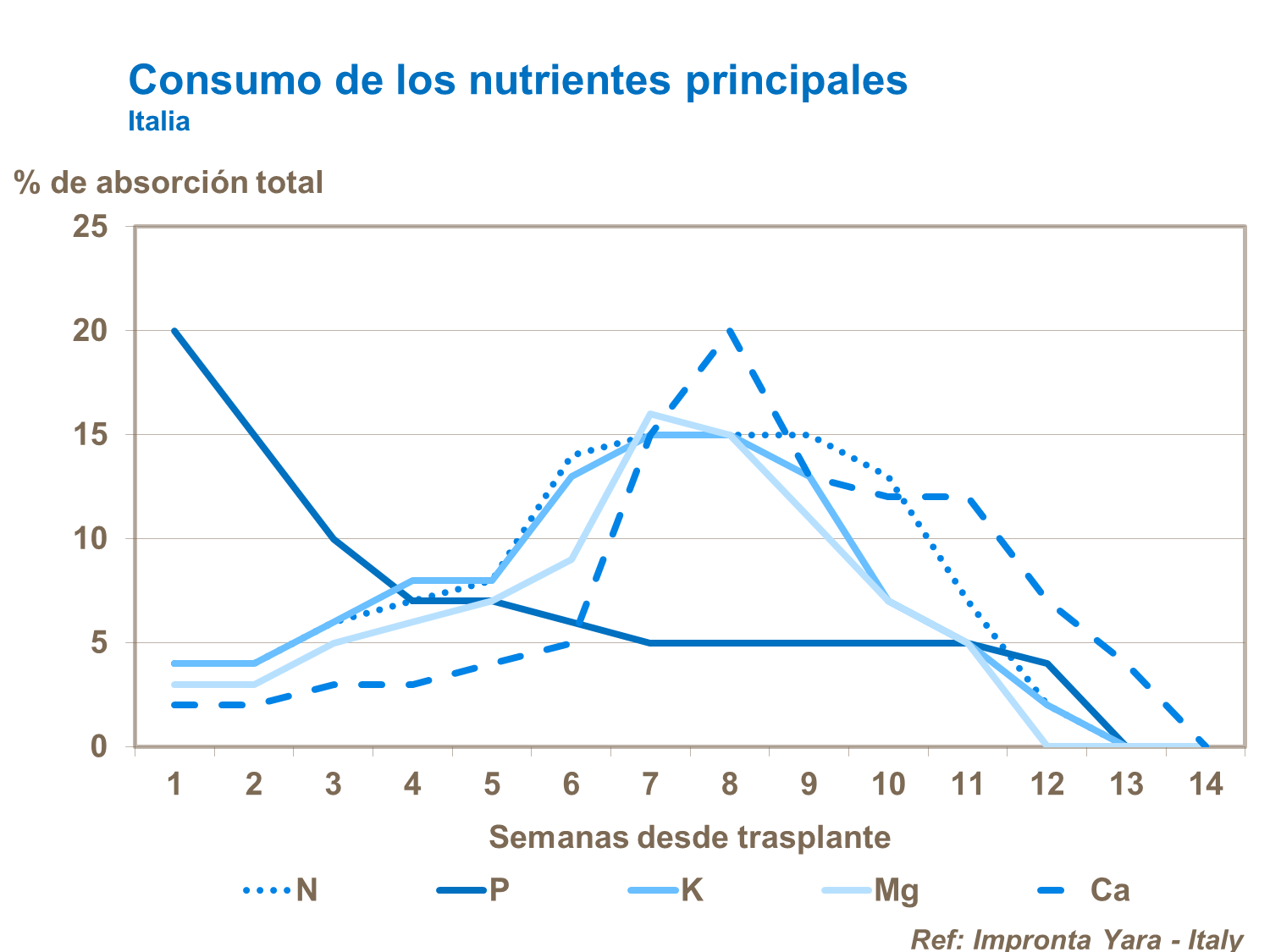 Mientras que el mayor consumo de fósforo tiene lugar en una fase temprana, el nitrógeno tiene su pico poco antes de la floración. El calcio se necesita desde la floración pasando por el desarrollo del fruto hasta la cosecha.