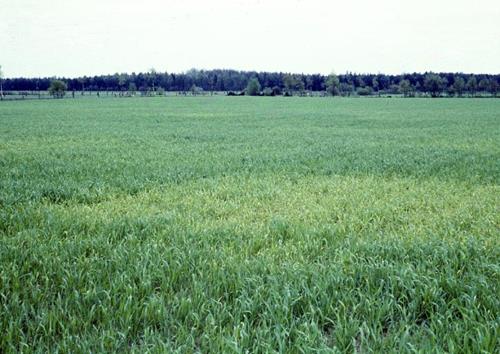Las hojas muestran clorosis y crecimiento reducido. Cuando la deficiencia avanza las puntas de las hojas se necrosan.