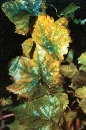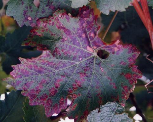 El amarille amiento (variedades blancas) o el enrojecimiento (variedades tintas) entre los nervios empieza en los bordes de las hojas y se extiende por las zonas internas de las hojas viejas. Los nervios mantienen el color verde durante un cierto tiempo.