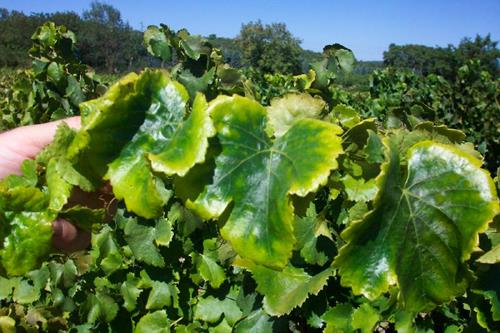 Los síntomas de una deficiencia ligera aparecen primero en las hojas cercanas a las uvas.