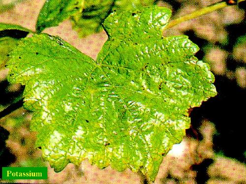 Los síntomas de una deficiencia leve aparecen primero en las hojas cercanas a las uvas. Generalmente las hojas viejas se ven afectadas primero. La deficiencia de potasio es una de las razones, entre otras desordenes fisiológicos que hacen que las bayas se marchiten y se sequen.